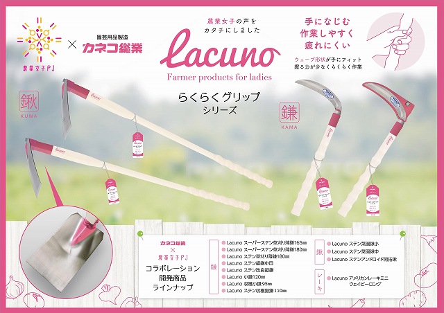 カネコ総業は、モニターなどを通じて農業女子の意見を取り入れたプロ向け・家庭菜園向けの使いやすい鎌、鍬、道具の開発を行うというテーマを掲げ、昨年12月より商品開発に取り掛かり、11月1日、ようやくここに新ブランド【Lacuno】シリーズを完成発売します。女性社長はじめ女性スタッフが先頭に立って、農業女子の方々を精一杯応援いたします。モニターはじめ、開発に携わっていただいた農業女子メンバーの方々には大変感謝申し上げます。ありがとうございました。心より御礼申し上げます。引き続き第二弾の商品開発に向けて商品開発会議を開催し、さらに農業女子の方々の明るい未来を応援いたします。